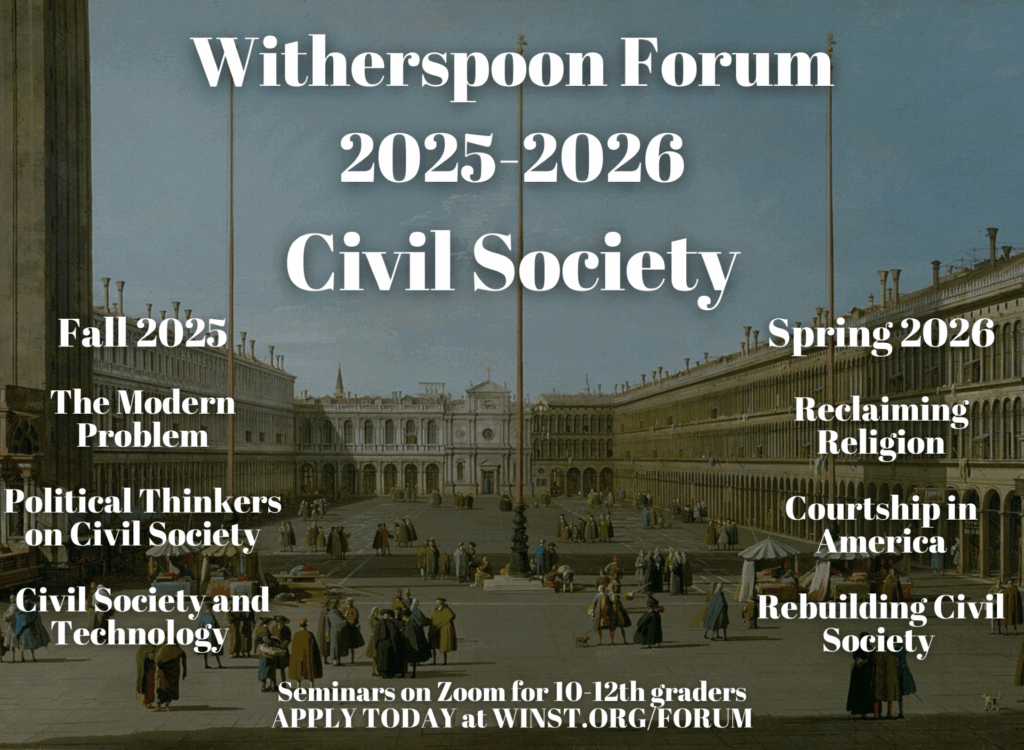 News NEWS A Civic and Educational Response to Campus ExtremismRead More Summer Seminars at the Witherspoon InstituteRead More R. J. Snell on the Return of MarcionismRead More New Publication: “The Death of Rabelais: A Play” by Jane Clark ScharlRead More Finding Truth and Friendship in Divided TimesRead More R. J. Snell Reviews “Natural Law: 5 Views”Read More R. J. Snell Speaks at Thomistic Institute Intellectual RetreatRead More CanaVox Releases Courageous ConversationsRead More Witherspoon Forum Fall 2025 – Seminars and DatesRead More Ryan T. Anderson, Founding Editor of Public Discourse, Appointed to Religious Liberty CommissionRead More Witherspoon Forum Spring 2025 – Seminars and DatesRead More Congratulations Professor WilsonRead More Witherspoon Forum Spring 2024 – Seminars and DatesRead More The Witherspoon Forum Launches Fall 2023Read More Public Discourse Welcomes New Managing EditorRead More Witherspoon to Host Undergraduate Colloquium on Faith and AstrobiologyRead More New Book on Theology and Science by Jamie Boulding, Witherspoon’s Associate DirectorRead More Public Discourse, the Witherspoon Institute’s Online Journal, Seeks New Managing EditorRead More The Witherspoon Institute announces its Spring 2023 SeminarsRead More Apply Today for the Witherspoon Institute’s Summer 2023 SeminarsRead More R.J. Snell, Witherspoon’s Director of Academic Programs, to speak at ISI Spring 2023 ConvocationRead More Webinar on the Witherspoon Institute’s New Book, Marriage and the Public GoodRead More Reading recommendations from Public Discourse and the Witherspoon Institute.Read More Witherspoon Online Seminars For High School StudentsRead More The Detransition DiariesRead More The Witherspoon Institute announces its Fall 2022 SeminarsRead More The Witherspoon Institute publishes second edition of Marriage and the Public GoodRead More High School Women Participate in Summer SeminarRead More Witherspoon Welcomes High School Students to the Moral Life & Classical Tradition SeminarRead More The Witherspoon Institute Announces Its Spring 2022 Seminars!Read More Applications for Witherspoon’s summer seminars and internships now open!Read More Witherspoon’s Senior Fellow Robert P. George and Academic Director of Canavox, Ana Samuel, to speak at Love & Fidelity Network ConferenceRead More The Witherspoon Institute announces its Fall 2021 SeminarsRead More Human Rights Fellow Chen Guangcheng speaks at International Religious Freedom summit, interviewed on EWTN NewsRead More Students Attend Witherspoon’s 2021 Summer SeminarsRead More We’re Hiring! Operations Manager for CanaVoxRead More Witherspoon Fellow Margarita Mooney Suarez Publishes The Love of Learning: Seven Dialogues on the Liberal ArtsRead More A Letter from the Editors of Public DiscourseRead More New Online Seminars for High School Students in MarchRead More R. J. Snell to become PD Editor-in-Chief, Ryan T. Anderson to become President of EPPCRead More Witherspoon Offers Winter Term Online Seminars for High School StudentsRead More Introducing CanaVox Varsity – For College Students, Graduates, and Young ProfessionalsRead More Applications for Summer 2021 Seminars and Internships Now Open!Read More Witherspoon offers new online seminars for high school students this fallRead More Witherspoon Summer Faculty to Speak at the Love and Fidelity Network ConferenceRead More Candace Vogler will lead a new seminar series with David Brooks of the New York TimesRead More Michael C. Maibach, Witherspoon Trustee, Appears in New Documentary on the Electoral CollegeRead More Chen Guangcheng Speaks at Republican National ConventionRead More The Witherspoon Institute announces its Fall 2020 SeminarsRead More Work of Mark Regnerus continues to make an impact: American Journal of Psychiatry retracts overreaching claimsRead More Online summer seminars bring students across the country (and the world) into conversation with great scholarsRead More Read Sen. Josh Hawley’s Remarks on the Conservative Movement and the Supreme Court in Public DiscourseRead More CanaVox’s 2nd Edition of Tips for Talking to Your Kids About Sex is Available on AmazonRead More Sen. Marco Rubio Writes for Public Discourse on Death of George Floyd and Racism in AmericaRead More Public Discourse Welcomes Its New Contributing Editor, Andrew T. WalkerRead More Can Health Care Providers Discriminate Against COVID-19 Patients on Basis of Age or Disability?Read More Dr. R.J. Snell gives lecture at the Friendship, Love & Happiness ConferenceRead More Chen Guancheng writes in the Washington Post about role of authoritarianism in the coronavirus outbreakRead More Interview with Robert P. George and R. J. Snell on their book Mind, Heart and SoulRead More The application deadline for Summer Seminars is February 11th!Read More Announcing our Spring 2020 Seminars!Read More Intersession Seminar on Integralism and LiberalismRead More Help Public Discourse Meet a $25,000 Match!Read More 2020 Summer Seminar and Internship Applications Are Open!Read More Dinner and Discussion with Professor Sanjeev KulkarniRead More CanaVox series featured on LA Catholic Morning showRead More Robert P. George receives John Paul II New Evangelization AwardRead More Life After College: Finding Fulfillment in Both Parenthood and ProfessionRead More Ana Samuel moderates discussion on digital attention economyRead More Announcing our Fall 2019 Seminar SeriesRead More Serena Sigillito awarded prestigious Robert Novak Journalism FellowshipRead More Maura Shea named 2019-2020 Leonine FellowRead More Witherspoon welcomes new staffRead More Students come to Princeton for Witherspoon’s Summer SeminarsRead More The Christian Origins of Religious FreedomRead More R. J. Snell: “The Natural Law: What it is and Why it Still Matters to Policymaking”Read More Tocqueville’s America: 2019 Intellectual RetreatRead More 2019 Summer Seminars: Apply Now!Read More 2019 Summer Internships: Apply Now